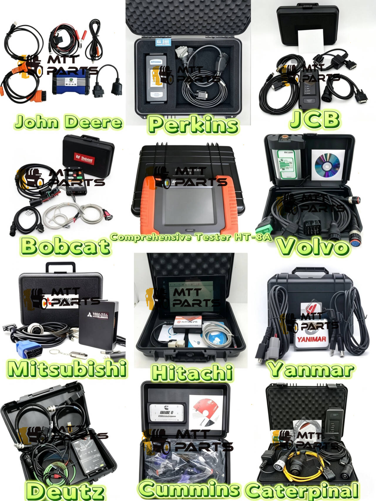 What stands out is how practical they look. No generic tools that might half-work; these are brand-specific setups that connect properly and give you the data you actually need. There's even a comprehensive all-in-one tester (the HT-8A) shown in the middle, plus options for brands that are a bit harder to find good diagnostics for, like Yanmar or Bobcat.